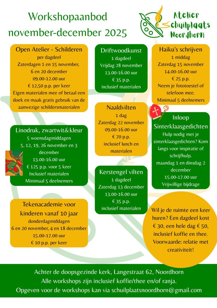 In de maanden november en december worden er acht verschillende workshops georganiseerd. Mensen kunnen kiezen uit: schilderen, linodruk, naaldvilten, driftwoodkunst of haiku’s schrijven. Daarnaast is er ook de tekenacademie voor kinderen vanaf 10 jaar, kunnen deelnemers terecht om hun eigen kerstengel te vilten en is er de inloop voor Sinterklaasgedichten. Voor meer informatie kan er contact worden opgenomen met schuilplaatsnoordhorn@gmail.com.