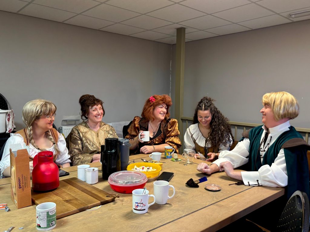 Voor deze allereerste show, zijn de vijftien spelers samengekomen in de kantine. Daar wordt de laatste finishing touch gedaan aan de schmink en haren. Al meer dan zeventig jaar voert Stichting Het Sprookje verhalen op voor basisschoolkinderen, vertelt voorzitter Miriam Weegenaar. “Als je als kind in het Westerkwartier naar het theater wilt gaan, moet je eigenlijk al naar de stad”, zegt ze. “Daarom willen wij kinderen op deze manier kennis laten maken met toneel, geluid en licht. Zo hopen we ze een theaterervaring mee te kunnen geven.”