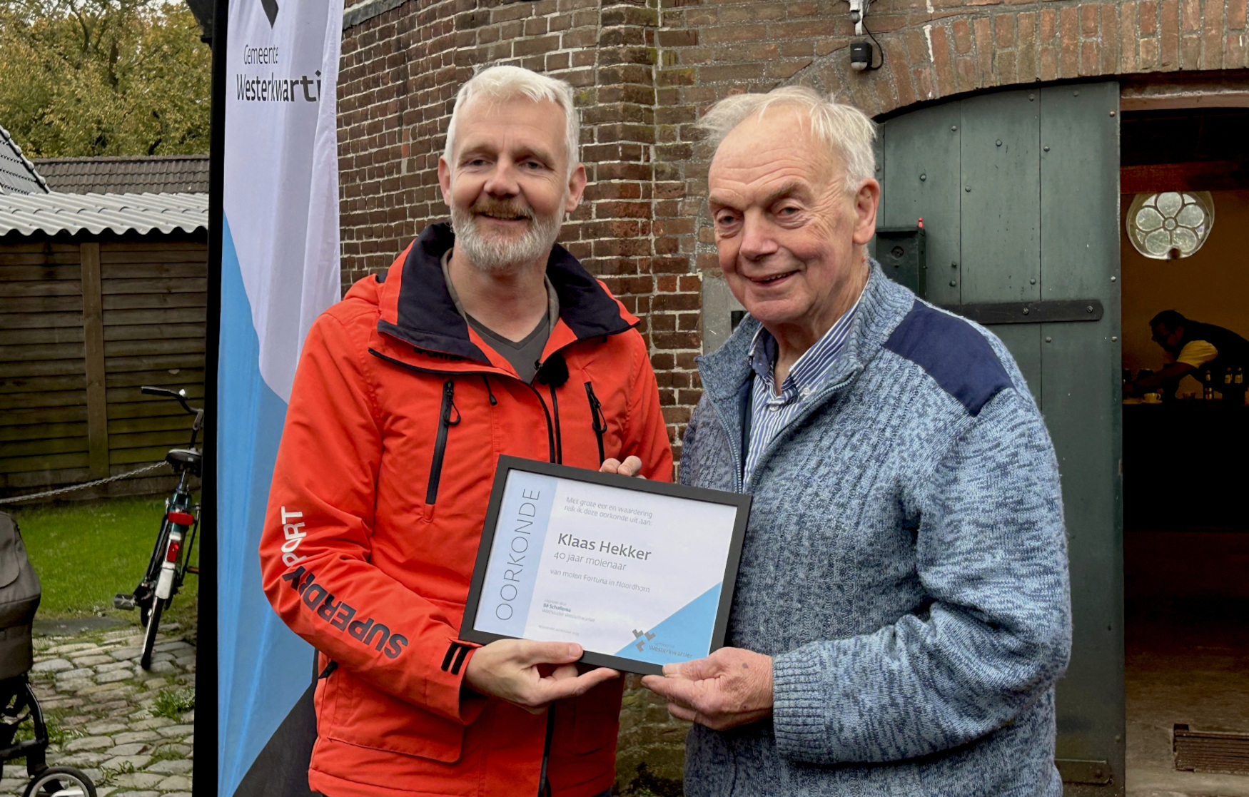 Tijdens de heropening werd ook stilgestaan bij het 40-jarig molenaarsjubileum van Klaas Hekker, die al zolang verbonden is aan de molen. Omdat hij niet de nieuwe onderscheiding ‘Westerkwartje’ kon ontvangen, als niet-inwoner van Westerkwartier, ontving de molenaar uit de handen van de wethouder een speciale oorkonde van gemeente. Hekker, die zijn dankbaar uitsprak tegenover verschillende mensen in zijn molenaarsleven: “Dat is hier al 40 jaar ben… Ik heb in Noordhorn gewoond en in Zuidhorn, en wij zijn uiteindelijk naar Assen verhuisd. Ik ben nog sterk, en heb er ongelooflijk veel plezier in om hier iedere keer weer te komen. Bedankt!”