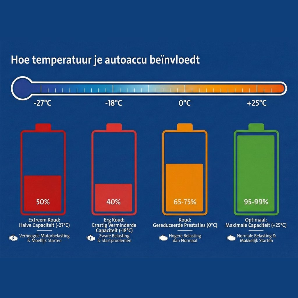Autoaccu’s presteren dramatisch slechter in koude omstandigheden. Bij 0°C (32°F) levert een accu ongeveer 65% van zijn normale capaciteit, terwijl bij rond -18°C dit daalt tot ongeveer 40%. Tegelijkertijd wordt motorolie dikker, waardoor de startmotor meer kracht nodig heeft om de motor te starten. Dit dubbele effect verklaart waarom veel pechgevallen in de winter beginnen met een lege accu.
