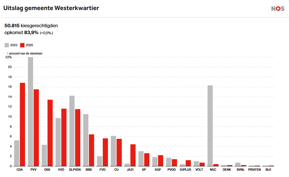 Uitslag Tweede Kamerverkiezingen 2025 in Gemeente Westerkwartier. © Afbeelding: NOS